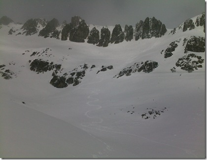 Esquiando por el corredor de las agujas. En estas deliberaciones me encontraba cuando recordé la sabiduría popular de “más vale lo malo conocido que lo bueno por conocer” y me decidí a bajar por el corredor por el que había subido entre las agujas. Es algo que no me había planteado y que descartaría en condiciones normales, por su pendiente y exposición, pero viendo en la subida que la condiciones eran bastante buenas, me animé. Aprovechando un claro me lancé, los primeros giros en la parte más estrecha perfectos, después la pala es amplia, pero la nieve cambiante de dura a profunda me jugó alguna mala pasada (sin consecuencias); el último tercio tiene algún tramo más pindio, pero sin problemas descendí hasta el fondo del circo.
