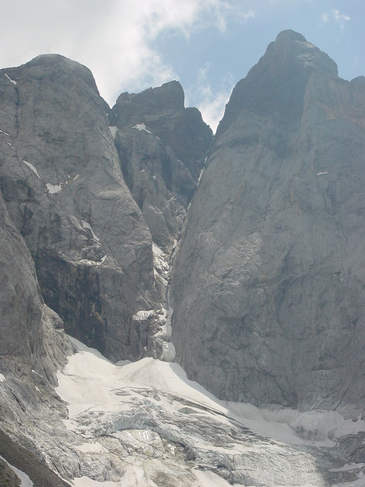 La grandiosidad de este paraje, comparable al gran circo de Gavarnie, me atrapó durante más de una hora, durante la cual fui escudriñando los entresijos de este gran macizo. Ante mí el Petit Vignemale (3.032 m) y su glaciar colgado, el Glaciar des Oulettes, el gran Vignemale o Pique Longue (3.298 m) y el "Couloir de Gaube", impresionante corredor que, en buenas condiciones, nos permitiría salvar esta cara norte en vertiginoso ascenso ... pero ¿de verdad se sube este corredor? -desde aquí parece totalmente vertical-.